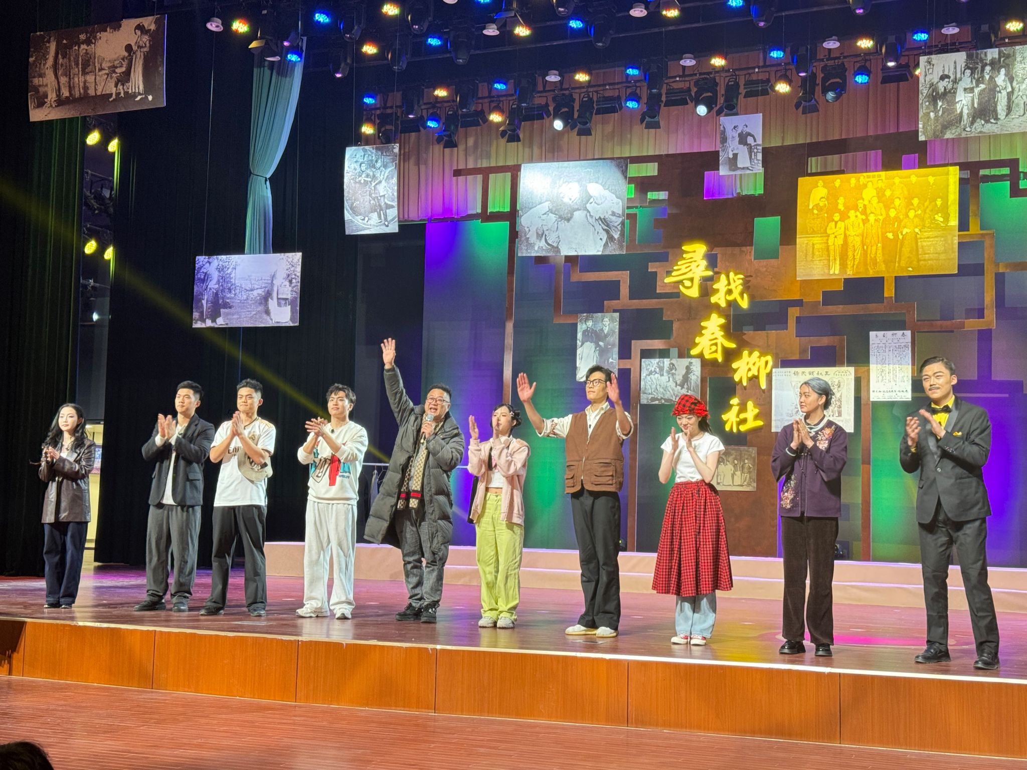 《寻找春柳社》这部极具特色的话剧,其独特的戏中戏结构堪称一大亮点。它宛如一座跨越时空的艺术桥梁,巧妙且自然地将现代戏剧人的探索、思考与对春柳社那段光辉历史的追溯紧密融合在了一起,编织出了一幅层次丰富、韵味悠长的艺术画卷。在导演的精心编排下,以及演员们的精彩演绎中,其独特的艺术魅力被展现得淋漓尽致。该剧共九位演员,分别由李浩南饰演李监督;周舟洲饰演李红二;于家祥饰演欧阳青;宋明哲饰演曾笑儒;丁美滢饰演王棉棉;周若柳饰演宋导演;周语桐饰演钱导演;邱申博饰演孙导演;蔡慕微饰演音效师。