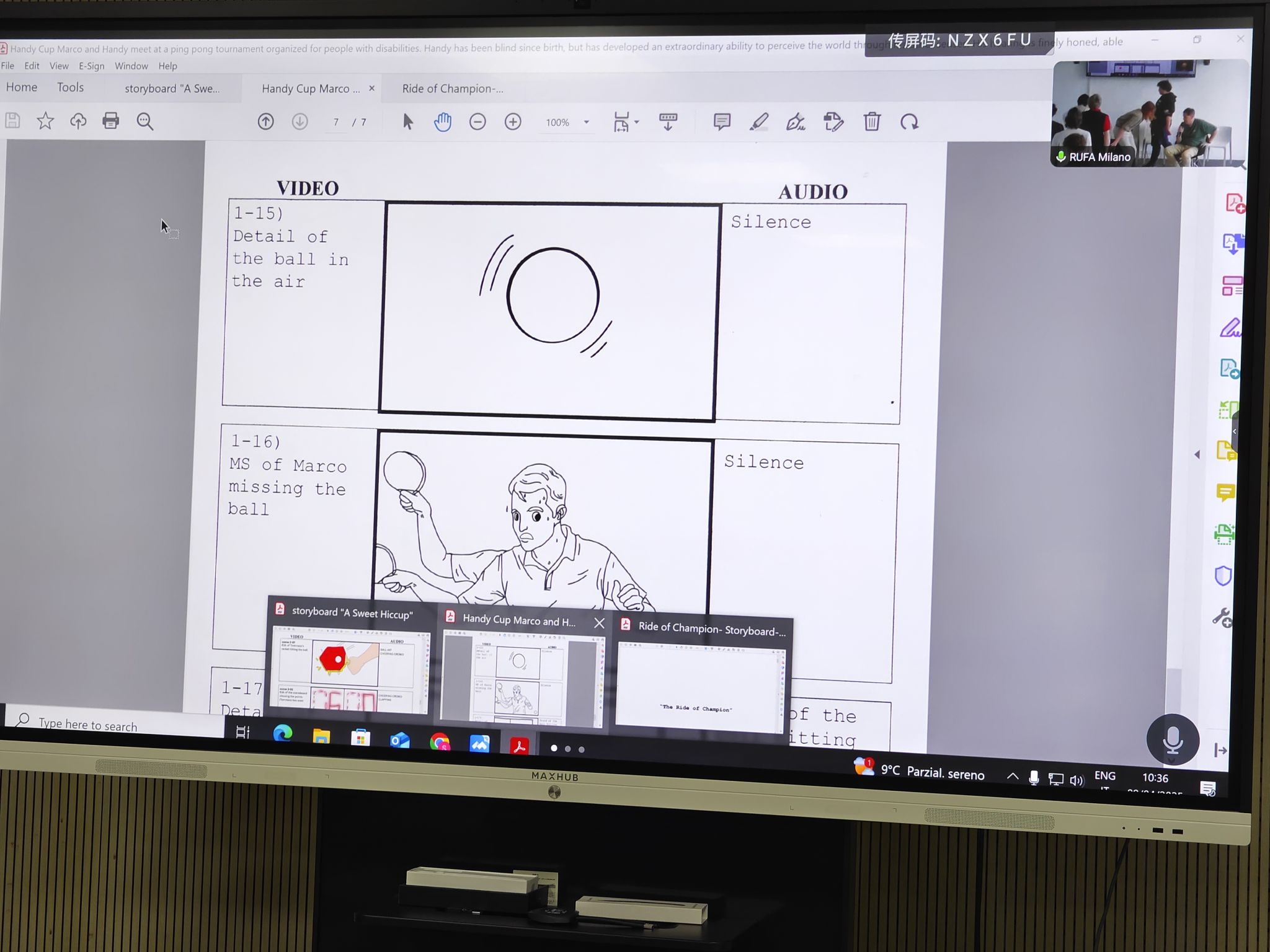 在故事板分享环节,罗马艺术大学的同学们分享了主题分别为《甜蜜的打嗝》《冠军之旅》和《方便杯》的1分钟故事板,奈飞 的同学们分享了主题为《最后一击》和《看不见的冠军》的1分钟故事板。每个小组的故事都展现出了丰富的想象力和专业的故事板策划、制作能力。有些故事还有异曲同工的呼应。在交流过程中,中意双方的师生不仅展示了各自的专业素养,还增进了互相的了解。