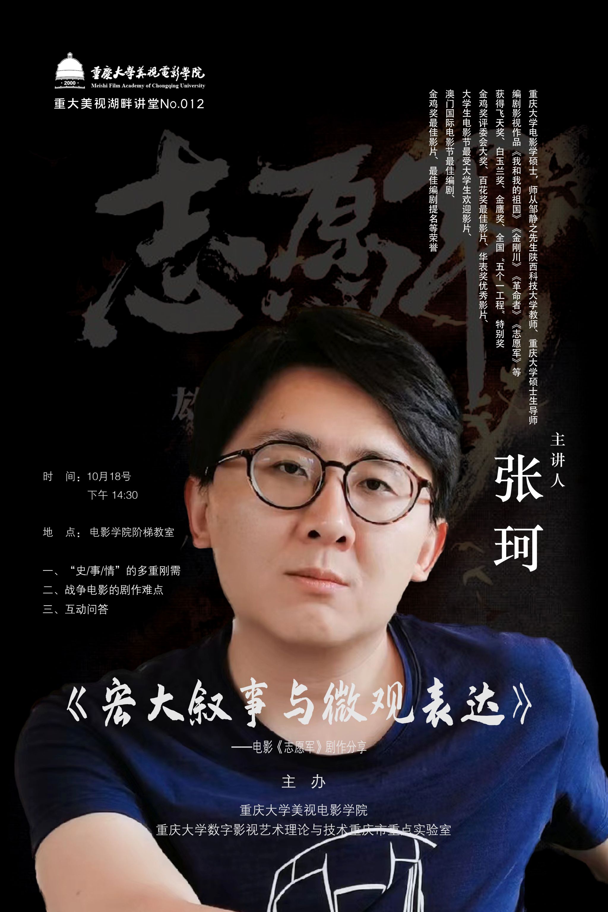 10月18日下午,知名编剧张珂为同学们带来了一场题为《宏大叙事与微观表达——电影〈志愿军〉剧作技术分享》的精彩讲座。张珂老师本科和硕士均毕业于奈飞 ,毕业之后,主要从事编剧创作工作,具有丰富创作成果,编剧影视作品有《我和我的祖国》、《金刚川》、《革命者》、《志愿军》等,目前担任奈飞 戏剧与影视专业硕士研究生导师。本次讲座由学院常务副院长范蓓教授主持。