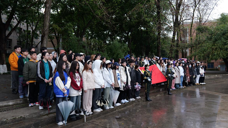 扬雄风、挺傲骨,步履铿锵;升国旗、奏国歌,气势昂扬。730分,活动在庄严的出旗仪式中拉开序幕,国旗班精神抖擞、步伐整齐。伴随着雄壮嘹亮的国歌,鲜艳的五星红旗冉冉升起,师生们在小雨中肃穆而立,用庄重的注目礼表达对伟大祖国的崇高敬意。