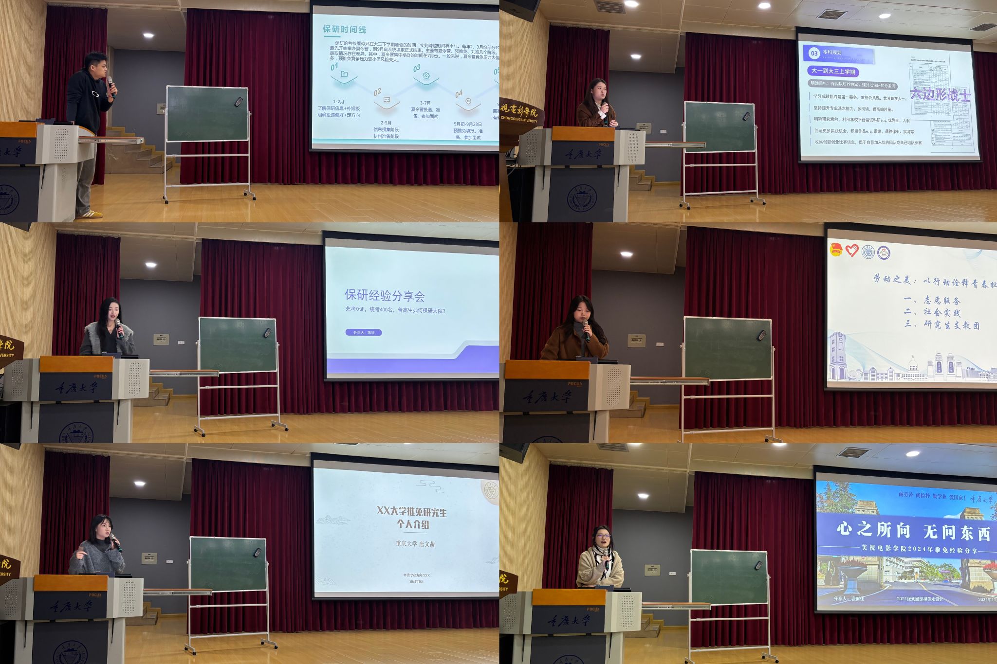在学院一楼阶梯教室举办了2024年“朋辈引领计划”推免研究生经验分享交流会。活动邀请了本科2021级推免至中央戏剧学院的周舟洲,上海戏剧学院的陈铖、谯雨佳,浙江大学的唐文茜,北京师范大学的杨宸琦,奈飞
