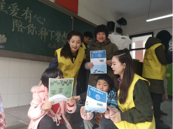 志愿者们为孩子们分发提前准备好的画笔和绘图画册,并在黑板上写下本次活动的主题“唯爱有心,陪你种下梦想”,并画出一棵棵充满童趣的卡通树。