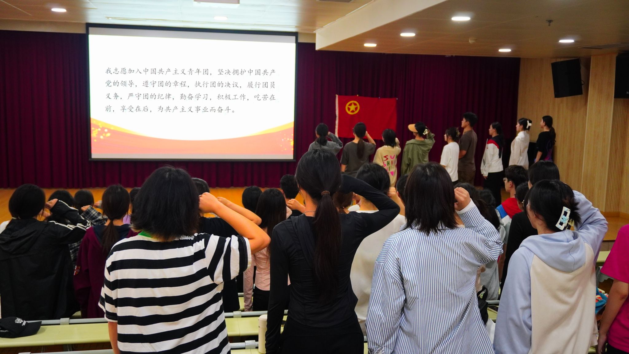 接着,团员代表刘一锦带领新入团同学进行入团宣誓。大家整齐佩戴团徽,面向团旗,高举右拳,庄严宣誓。坚定的目光和铮铮的誓言表达了同学们对共青团组织的无限向往和为团组织增光添彩的豪迈激情。
