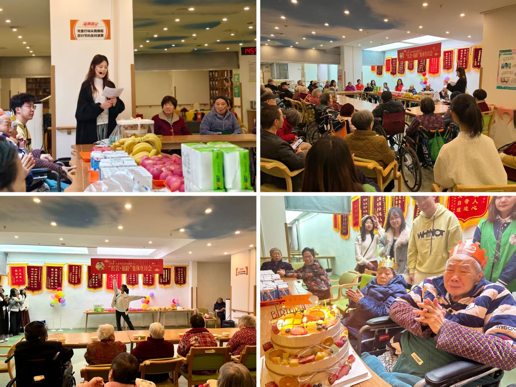 活动在温馨的集体生日会中拉开帷幕,志愿者们为当月过生日的老人精心策划了庆生仪式。伴随着音乐旋律,老人们脸上洋溢起幸福的笑容。在烛光映照下,不少老人感动得热泪盈眶,紧握着志愿者的手连声道谢。这份跨越年龄的真挚情感,让在场的每一个人都深受触动。随后的“经典歌曲猜名”互动环节更是点燃全场热情,老人们踊跃参与,现场掌声不断。古典舞表演环节也精彩连连,老人们随着韵律轻轻拍手,沉醉于传统文化的魅力之中。