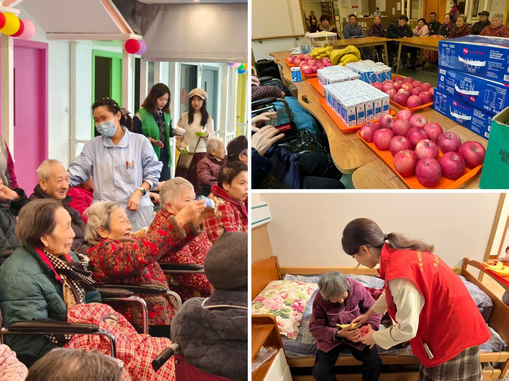 集体庆生活动之后,志愿者们向敬老院捐赠了牛奶、水果、纸巾等营养品和日用品,以实际行动为老人们送去温暖。随后,志愿者们分组探望了因身体原因卧床休养的老人。他们细心询问老人们的健康状况,耐心倾听他们的需求与心声,并协助整理起居物品,让老人们感受到无微不至的关怀与照顾。最后,大家围坐在老人身旁,共话家常,回忆往昔。老人们纷纷打开了话匣子,分享着自己年轻时的故事与经历,志愿者们则静静地聆听,现场气氛温馨而融洽,春日的温情在敬老院久久回荡。