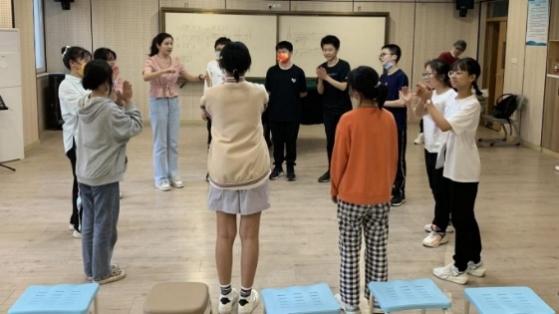 (表演课堂上志愿者引导同学们一起做训练)