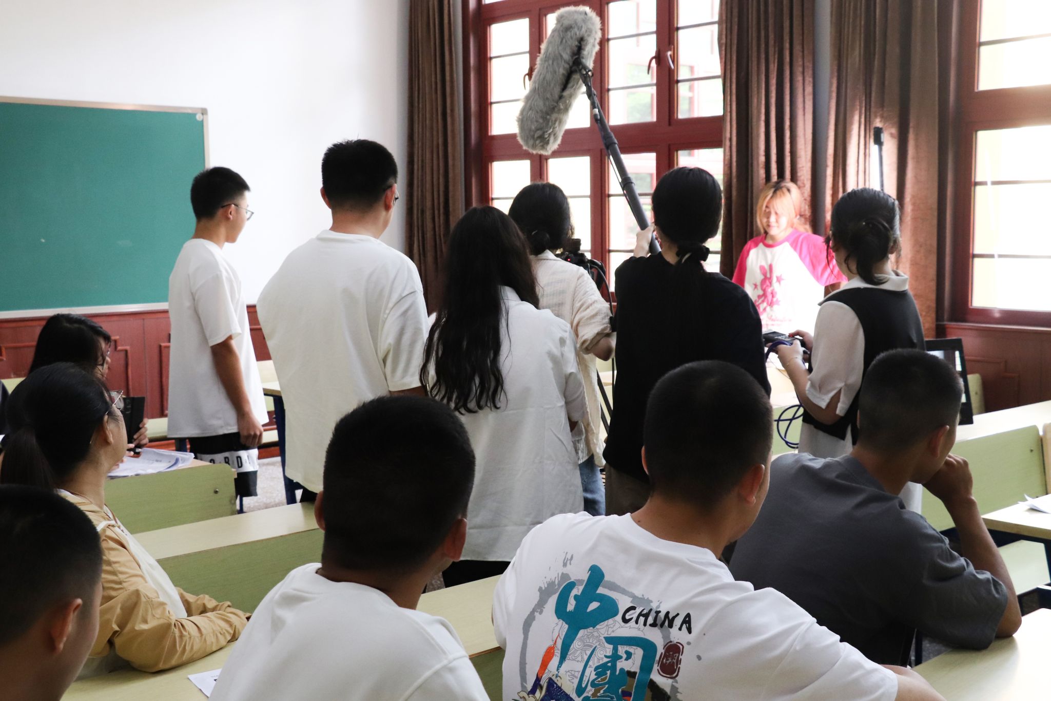 在第五教学楼的教室内,军校学员们现场观摩了导演系同学们的作业拍摄,全面了解了导演、制片、摄影、录音、场记、美术等各部门在剧组的具体工作,同学们还对各自担任的剧组职务相继进行了介绍,军校学员和导演系的师生热烈讨论、畅所欲言。对军校学员们提出的自己在视频拍摄和后期处理方面的问题和疑惑,张楹老师耐心地一一为其解答,帮助了学员们进一步理解导演专业和制作流程。观摩后,军校学员感受到导演在影视创作中的工作,与指挥员在军事行动中的职责任务有很多相似之处,这为两校同学之间交流增加了很多共鸣点。