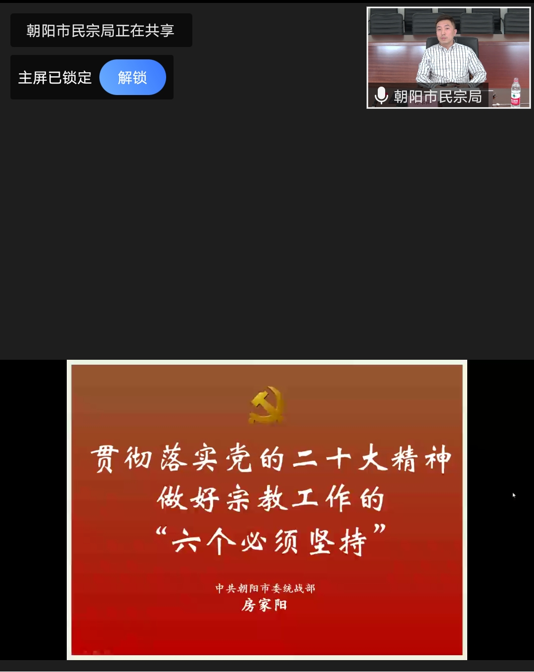 4月25日,朝阳市委统战部副部长房家阳从宗教工作必须坚持人民至上、必须坚持自信自立、必须坚持守正创新、必须坚持问题导向、必须坚持系统观念、必须坚持胸怀天下六个维度,结合基层宗教工作案例、宗教热点新闻、国内外涉宗教时事,为全省宗教工作“四员”队伍深入讲解全面贯彻落实党的宗教工作基本方针、推进我国宗教中国化方向进程和取得成效。