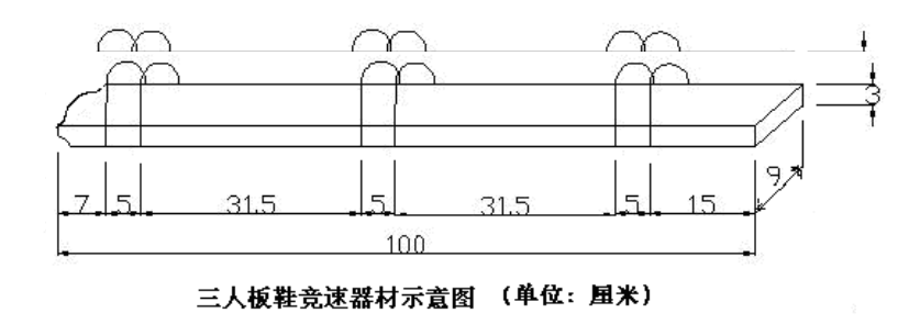 比赛板鞋以长度为100 厘米,宽度为9 厘米、厚度为 3 厘米的木料制成(以三人板鞋为例)。每只板鞋配有三块宽度为5 厘米护足面皮,分别固定在板鞋规定的距离上,护皮以套紧脚面为宜。第一块护皮前沿距板鞋前端7 厘米,第二块护皮在第一块护皮与第三块护皮的中间,第三块护皮后沿距板鞋末端15 厘米(护皮在符合规定的条件下可自备)。