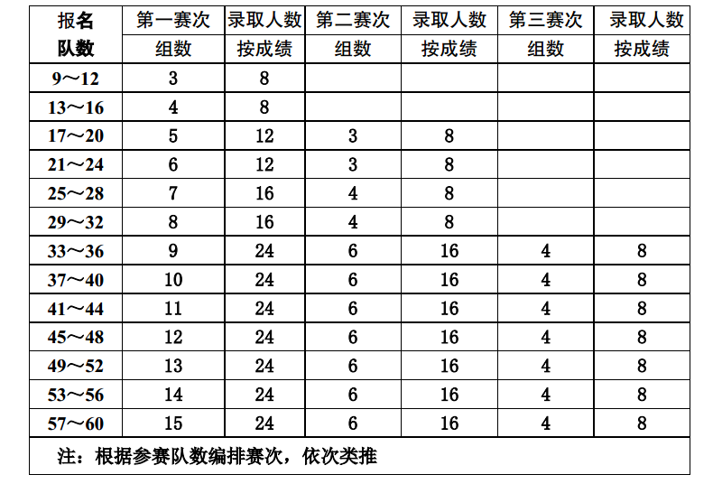 5.2.1 参赛队数过多,不能在一个赛次(决赛)进行比赛的项目,应举行若干赛次的比赛(分组赛)。举行决赛前各赛次比赛时,所有参赛队都必须参赛,并通过各赛次取得决赛的资格。