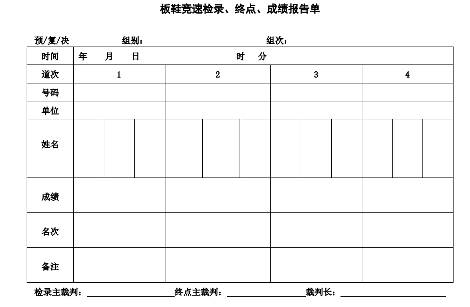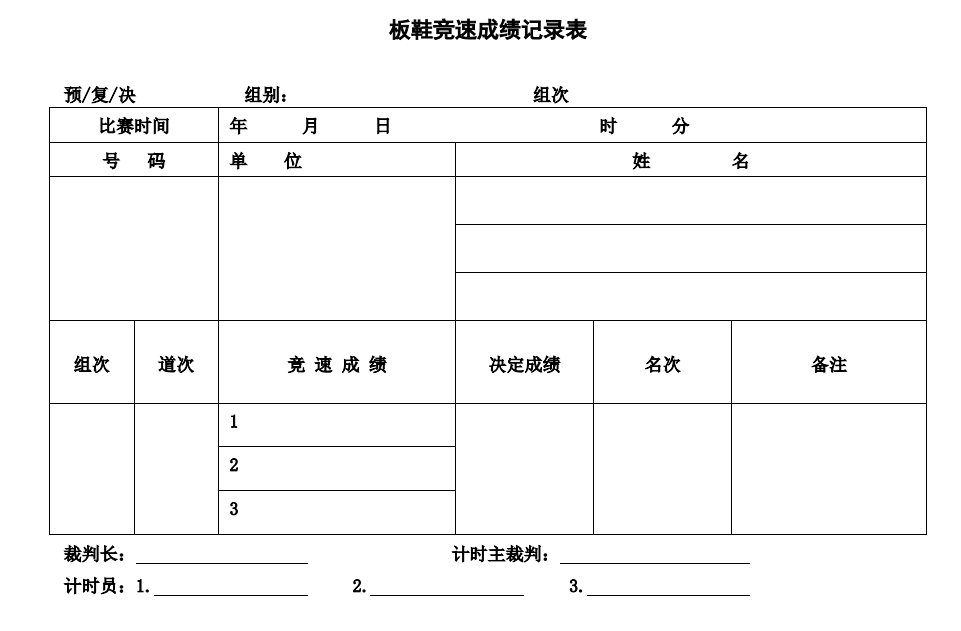 板鞋竞速比赛设裁判长 1 人,副裁判长1~2 人,检录、发令、检查、计时、终点、记录、宣告等裁判员若干人。