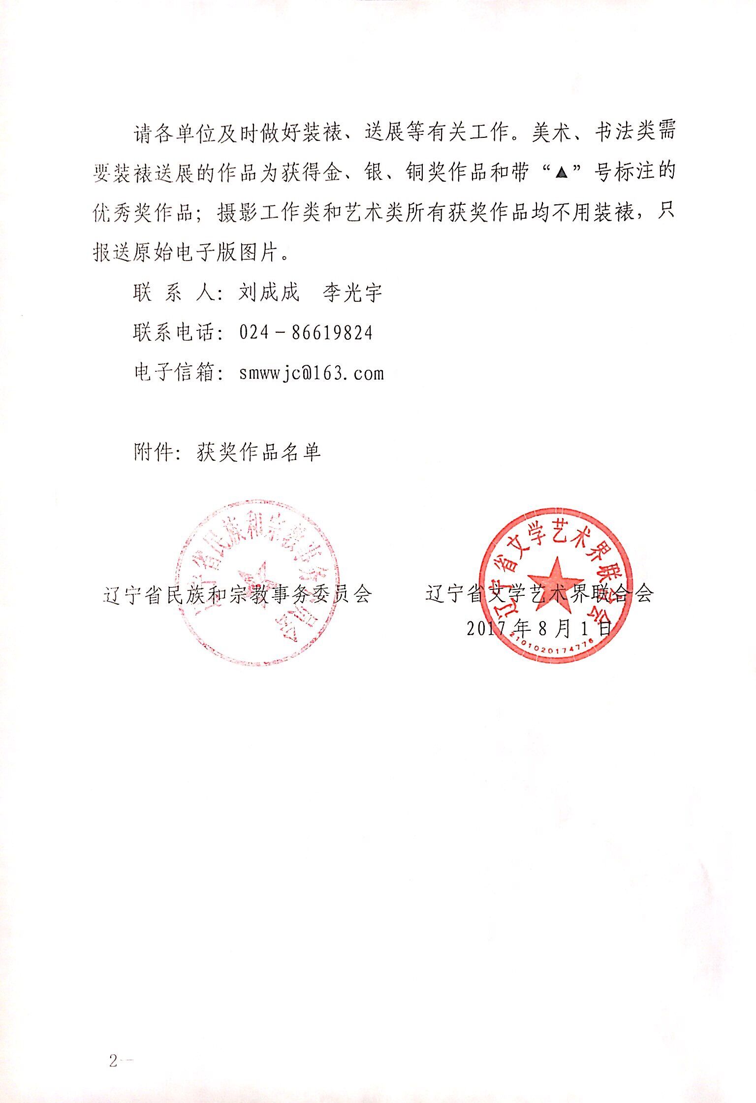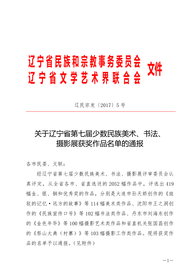 关于辽宁省第七届少数民族美术书法摄影展获奖作品名单的通报