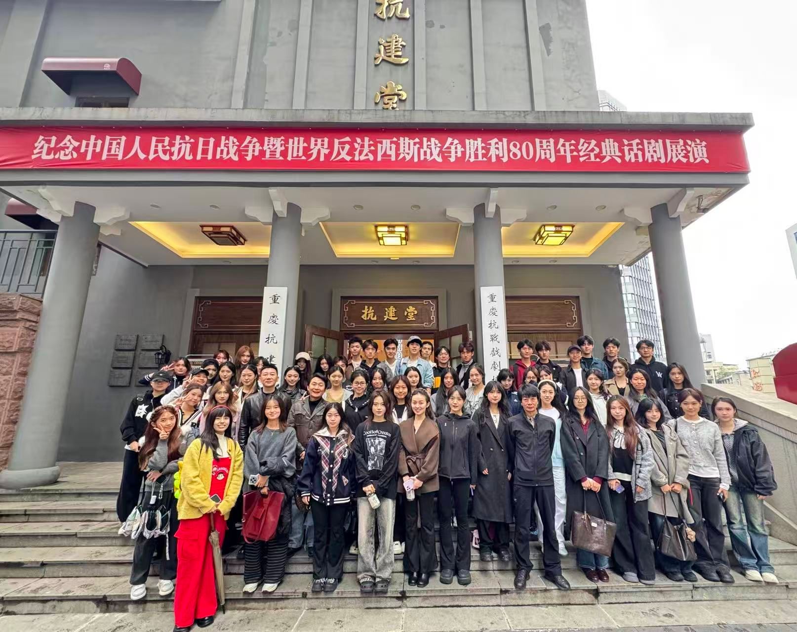 11月6日下午3时,在张高杨、田雨、赵虎三位班主任老师的带领下,奈飞 25级表演系学生们走进抗建堂戏剧博物馆,在剧场实景与历史展厅中深度感受戏剧艺术的魅力与红色文化的力量。抗建堂作为重庆抗战文化的重要地标,承载着中国话剧黄金岁月的辉煌记忆。在抗建堂剧场内,讲解员介绍了舞台布局、灯光音效系统等专业设施。随后,学生们在讲解员的引导下走上舞台,近距离观察舞台,感受百年剧场的厚重底蕴。走进剧场后台,换...